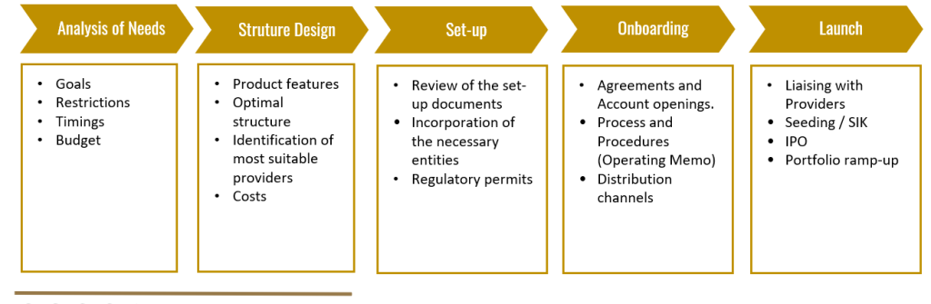 Full coordination of the project and liaison with the different providers and stakeholders, from the structuring to the launching of the investment vehicle.